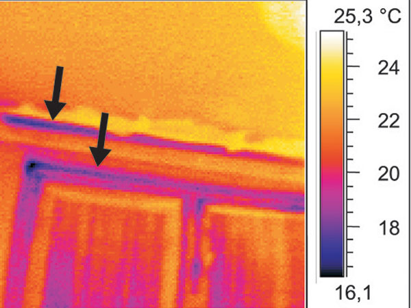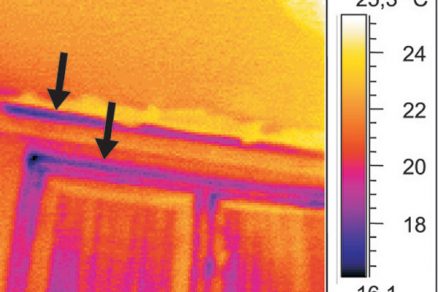 | Zatekanie v mieste nadpražia pod balkónom (nevhodne riešený, prípadne porušený detail hydroizolácie balkóna v styku s obvodovou stenou) | Termovízna snímka nadpražia balkónových dverí (zníženie povrchovej teploty v mieste tepelného mosta (LB) |