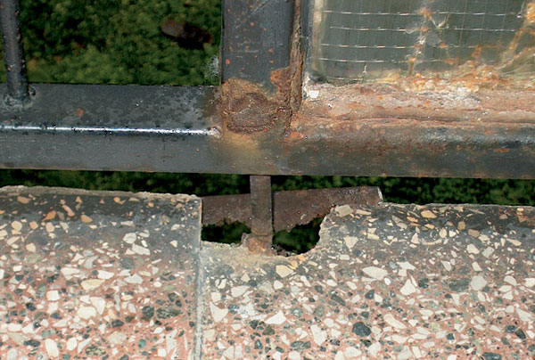 | Porušená nášľapná vrstva podlahy – zakorenenie rastlín urýchľujúce ďalšiu degradáciu podlahy, porušený odkvap a styk podlahy balkóna s obvodovou stenou | Detailný pohľad na skorodovaný kotevný stĺpik a nosný rám zábradlia |