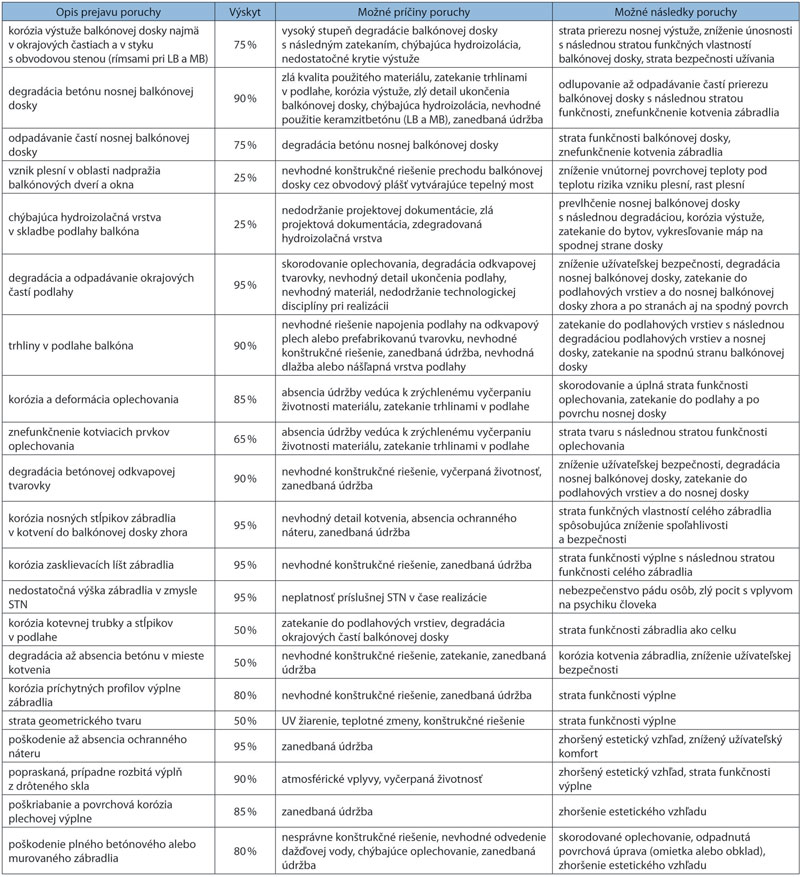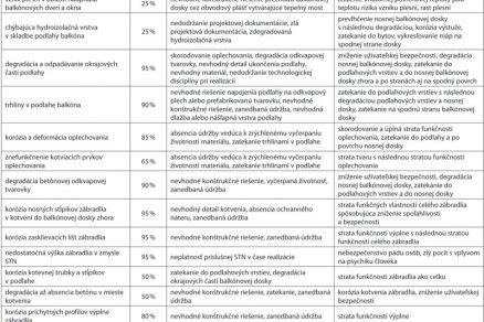 Tab. 1 Opis prejavov, príčin a možných následkov porúch balkónov (pre väčšie zobrazenie kliknite na tabuľku)