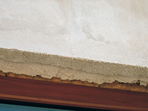 Trhlinky na preklade nad vstupom na terasu sa odporúča, vzhľadom na veľký rozpon a materiál prekladu (betón), po otlčení uvoľnených častí omietky a ich murárskejoprave a vyrovnaní plošne upraviť výstužnou sklenenou tkaninou uloženou v organickom lepidle pre zatepľovacie systémy. Pri tejto úprave odporúčame začistiť ukončenie nadpražia štandardnou APU lištou a na roh nadpražia osadiť rohovú lištu. Posledným krokom opravy bude, samozrejme, opäť farebné zjednotenie povrchu fasády.