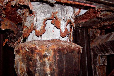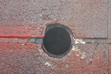 | Vpust, pri ktorom sa zrekonštruoval hydroizolačný povlak, ale iba ten. Pri väčšine strešných plášťov u nás, kde sa použili staré liatinové vpusty, treba veľmi opatrne skontrolovať stav týchto vpustov. V mnohých prípadoch sú silno skorodované a treba ich vymeniť. Samozrejme, že liatinové vpusty vďaka svojim charakteristikám umožňujú povrchovú kondenzáciu, ktorá je pri nových plastových vpustov takisto vylúčená. | |