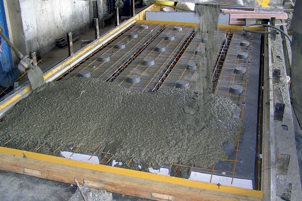 Po osadení hornej výstuže ostanú plastové vložky v úlohe strateného debnenia, nad ktorým sa panel dobetónuje.
