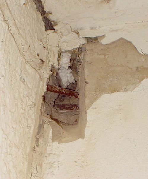 V mieste stykov stenových lodžiových panelov a hlavného objektu boli objavené nielen trhliny s rôznymi šírkami od 0,1 do 15 mm, ale po vykonaní skúšok a búraných sond sa prejavili aj závažné nedostatky zálievkových mált, ktoré majú okrem iného chrániť výstuž montážneho styku pred elektrochemickou koróziou. Na zálievkovej malte montážneho styku sa najprv vykonala skúška povrchovej nasiakavosti podľa STN 73 2578. Na základe skúšky vznikla domnienka, že zálievková malta zrejme nemala parametre požadované na správne fungovanie montážneho styku. Rýchlosť vsakovania vody do povrchu zálievky a množstvo vody boli nadštandardne vysoké. Na realizáciu búraných sond sa zisťovala miera karbonatizácie  zálievkovej malty a uloženie výstuže styku. Výstuž je uložená viac-menej v polovici hrúbky stenového panelu. Kolorimetrickým testom sa zistilo, že zálievková malta je úplne skarbonatizovaná.