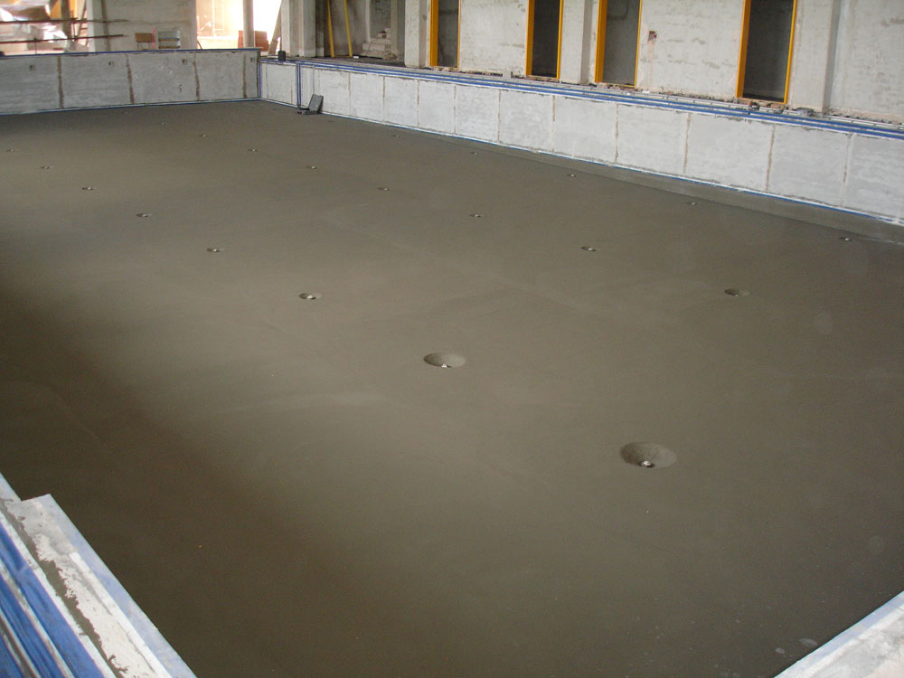 Podlaha bazénu sa vyrovnala rýchloväzným cementovým poterom Topcem Pronto v kombinácii s adhéznym mostíkom na zložité a nesavé podklady Eporip, ktorým sa zabezpečilo spojenie nového poteru s podkladovou vrstvou.