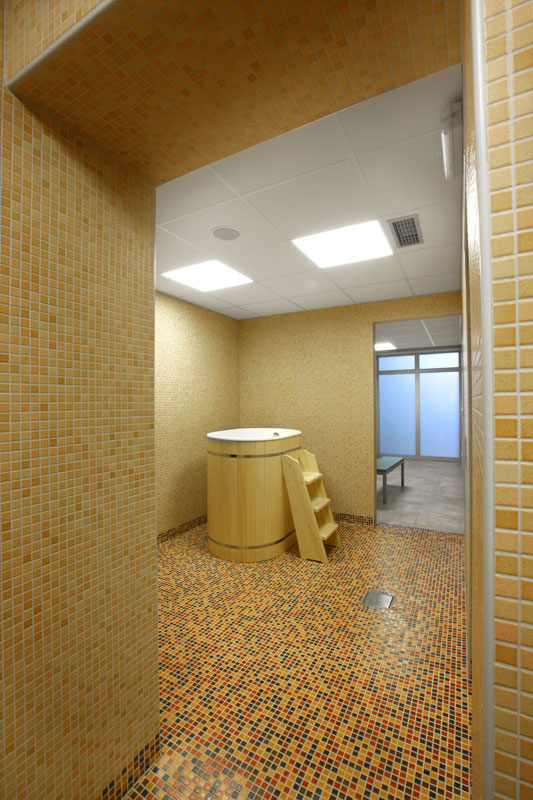 Pri stavbe relaxačného centra, ktoré je prepojené s plaveckou halou sa aplikovali rovnaké materiály, aké sa použili na realizáciu veľkého bazénu. Všetky bazénové telesá relaxačného centra sa realizovali z monolitického betónu. V rámci prípravy podkladu sa musel povrch dna a stien vyrovnať. Postup stavebných prác bol rovnaký a uplatnili sa tu aj rovnaké stavebné materiály. V záchytnom bazéne tobogánu, v sprchách a na nosných kruhových stĺpoch sa na lepenie sklenej mozaiky použilo biele lepidlo Adesilex P10 s tekutou prísadou Isolastic. Škárovanie sa realizovalo so škárovacím materiálom Kerapoxy.
