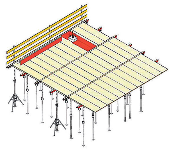 Výška držadla (hornej tyče) dočasného zábradlia nad pracovnou podlahou musí byť v sú­lade s vyhláškou MŽP SR č. 532/2002 Z. z., ktorou sa ustanovujú podrobnosti o všeobecných technických požiadavkách na výstavbu a o všeobecných technických požiadavkách na stavby užívané osobami s obmedzenou schopnosťou pohybu a orientácie, minimálne 1 100 mm. Zábradlie musí tvoriť minimálne držadlo (horná tyč) a zarážka pri podlahe (ochranná lišta) s výškou minimálne 150 mm (obr. 1). Na aplikáciu systémového debnia alebo lešenárskych zostáv sa vzťahujú špecifické predpisy (obr. 2).