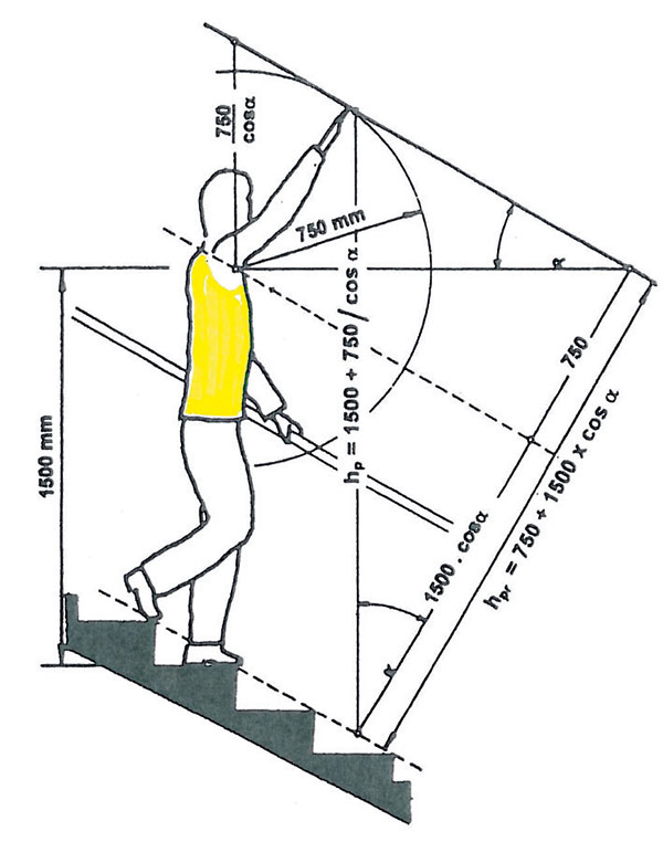 Výška zábradlia sa navrhuje v súlade s dvoma kritériami: ochrany proti pádu a opory pri stúpaní. V prvom prípade je nutné vychádzať z priemernej výšky človeka (1 750 mm) Podľa toho vychádza teo­retická výška zábradlia pod spodný okraj hrudného koša osoby (1 100 mm). Na určenie výšky zábradlia v schodiskovom priestore je potom rozhodujúca hĺbka, do ktorej by osoba mohla prepadnúť. Môže byť predpísané zábradlie s výškou 900, 1 000, 1 100 alebo 1 200 mm (tab. 1).