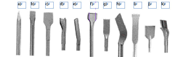 a) špiciak, b) plochý sekáč, c) kopistový sekáč, d) dlátový sekáč, e) škárovač, f) na dlaždice, g) zubové dláto,