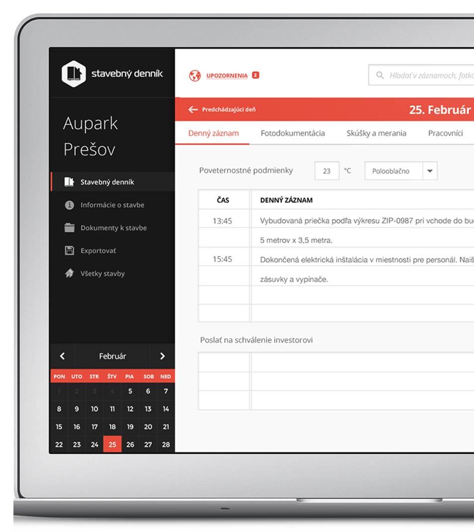 Ide o prehľadnú online aplikáciu, ktorá oproti tradičnému denníku poskytuje viaceré zvýhodnenia. Kompletnú realizáciu výstavby má každý stavbyvedúci teraz možnosť obsluhovať pomocou mobilu alebo tabletu. Riadenie, kontrola či zaznamenávanie stavebných prác tak nebolo nikdy jednoduchšie. Doterajší priebeh činnosti jediného stavebného denníka svojho druhu u nás nám bližšie priblížil tvorca myšlienky a hlavný iniciátor projektu Ing. Michal Petrík.