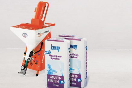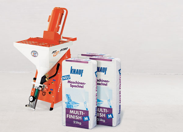 Firma Knauf PFT vyvinula stroj PFT RITMO powercoat na nanášanie vysokokvalitnej sadrovej stierky Knauf Multi-Finish M. Multi-Finish M tvorí v kombinácii so strojom Knauf PFT RITMO powercoat jeden systém. Ako sa pracuje s týmto systémom? Už žiadne miešanie práškového materiálu vŕtačkou vo vedre s vodou! Vrece jednoducho položíte na zásobník stroja rovno na špicaté zuby, ktoré ho roztrhnú, a obsah vreca vsypete do stroja. V stroji sa zamieša s vodou na potrebnú konzistenciu a pomocou nanášacej pištole možno začať striekať stierku na steny a stropy. Materiál sa nanáša rýchlo, rovnomerne, pod vysokým tlakom, s veľkou výdatnosťou a malou spotrebou, čím sa opäť šetria vaše náklady a čas na spracovanie – odpadá ručné nanášanie. Dosiahnuť najvyššiu kvalitu povrchu stupňa Q4 nepredstavuje pre Knauf Multi-Finish M v spojení s Knauf PFT RITMO powercoat nijaký problém.