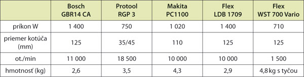 Čoraz viac výrobcov ponúka toto náradie v praktickom kufríku, resp. systaineri, so súpravou potrebných kotúčov a fréz s patentným rýchloupínacím systémom. Príkon náradia sa pohybuje od 700 do 2 500 W, brúsiace alebo frézovacie kotúče vyžadujú podľa priemeru 2 000 až 10 000 otáčok za minútu.