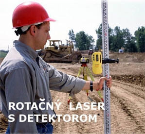Tieto práce nevyžadujú zvýšenú presnosť. Ideálnym prístrojom na výškové merania v exteriéri aj interiéri je rotačný laser. Prístroj sa osádza mimo staveniska, aby sa zabránilo jeho poškodeniu. V prípade, že je stavba rozsiahlejšia, môže sa prístroj osadiť do stredu stavby, aby dosahom a presnosťou pokryl celé stavenisko. Na obr. je prístroj a v pozadí je robotník, ktorý drží prijímač (detektor). Princíp merania je jednoduchý: rotujúca hlava lasera vytvára vodorovnú laserovú rovinu, ktorú robotník detekuje pomocou prijímača. Prijímač reaguje na prítomnosť laserovej roviny zvukovou a svetelnou signalizáciou. Robotník iba posúva prijímač po zvislej late a vyhľadáva laserovú rovinu. Ak ju nájde, prijímač mu to oznámi pípnutím.