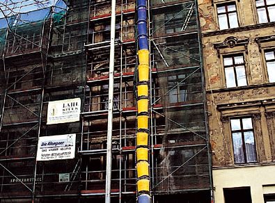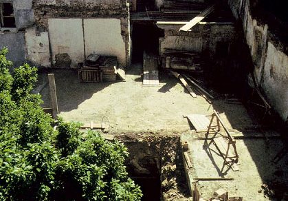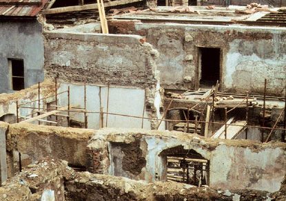 | Nesprávne načasovanie pamiatkovo chráneného domu v centre Banskej Štiavnice na zimu. Stav v októbri 1985 | Stav v máji 1986 po samovoľnom zrútení dvoch podlaží zadného traktu vplyvom podmočenia konštrukcie dažďom a snehom |