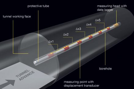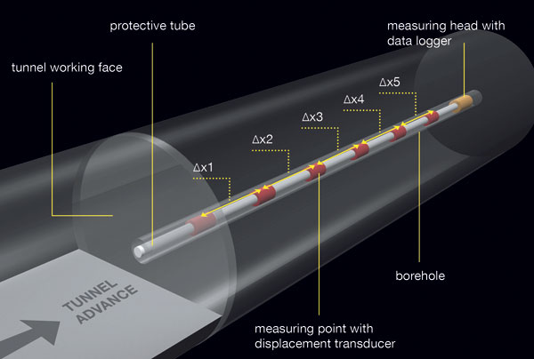 Uvedené skúšky pre etapu pred výstavbou sa používajú v ťažkých hydrogeologických a geotechnických podmienkach aj pri razení tunelov, napríklad v tlačivých horninách. Na hydrogeologické prieskumy sa horizontálne vrty vykonávajú z rozrážok alebo čelby, hydrogeologické parametre sa stanovujú na báze systému obturátorov Pump Down Packer System (PDPS). Na vyšetrenie deformačného správania pred čelbou razeného tunela sa vo vrtoch dlhých až 30 m vykonávajú merania pomocou posuvných deformetrov alebo vo vrtoch až do 100 m pomocou inovatívneho extenzometra s reverznou hlavou (MRHX©). Takéto merania poskytujú v predstihu informácie o možných deformáciách čelby a empirické hodnoty konvergencie. Tak zabezpečujú základné informácie na posúdenie potreby stabilizácie čelby pomocou kotiev. Prvýkrát sa extenzometer MRHX© použil pri výstavbe tunela AlpTransit Gotthard v masíve Tavetcher. Zariadenie pozostáva z reťazca jednoduchých extenzometrov (až 20 prvkov). V koncovej časti vrtu je zbernica dát, ktorá trvale ukladá namerané hodnoty v stanovených časových intervaloch (obr. 2). Odčítanie nameraných hodnôt možno vykonať kedykoľvek pomocou prenosového kábla a PC. Získané informácie poskytujú nepretržitú informáciu o rozložení deformácií [3].