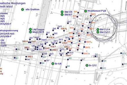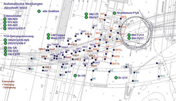 - 2 teodolity monitorujúce ulice a chodník, oporné múry a piliere mosta Luzernerring, ako aj rad domov Hüning – presnosť merania 2 mm,