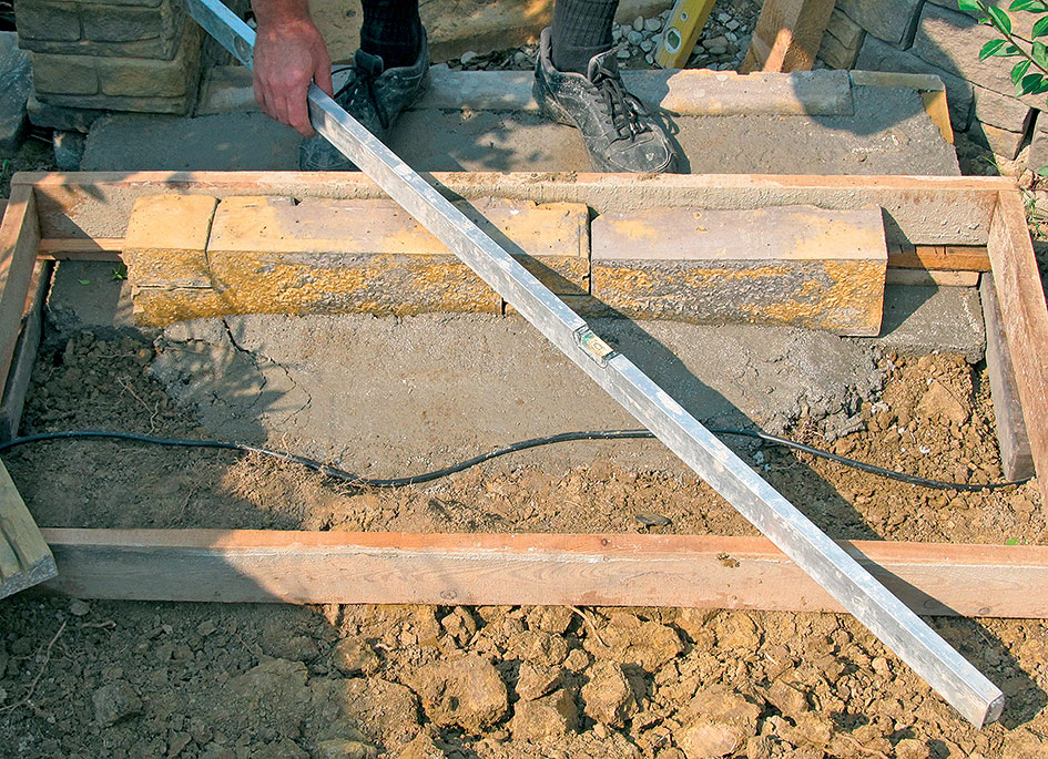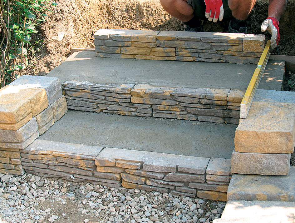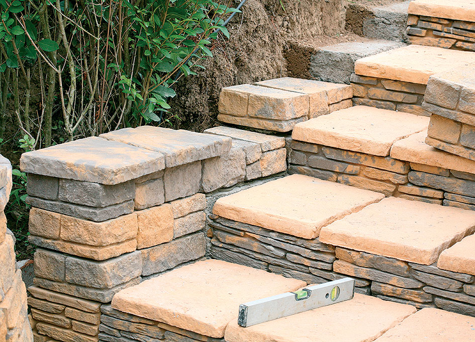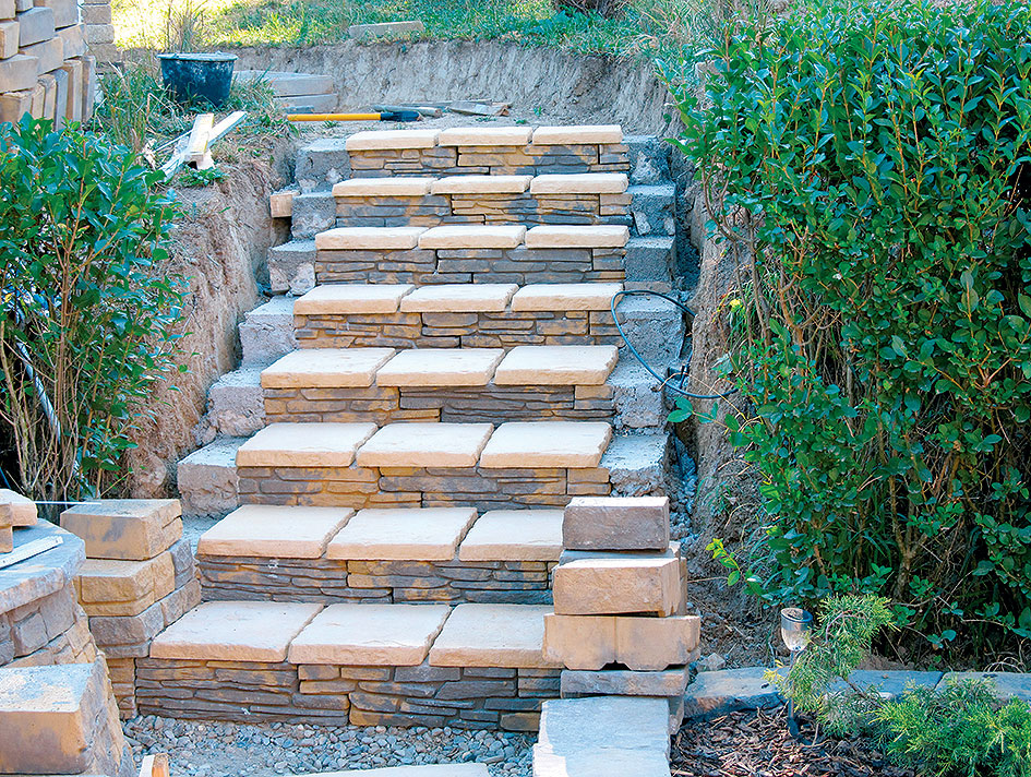 Na vybudovanie schodiska v záhrade, ktorá je umiestnená vo svahovitom teréne, možno použiť napríklad betónové platne v kombinácii s bočnými dielcami. Do svahu sa vykope schodisko podľa plánovaných rozmerov. Z drevených lát sa vytvorí debnenie podľa veľkosti schodu. Na dno sa nasype štrková vrstva s hrúbkou 100 až 150 mm.