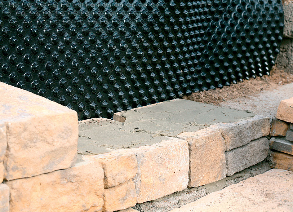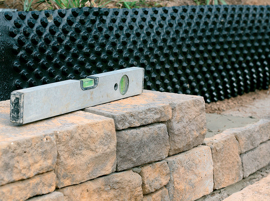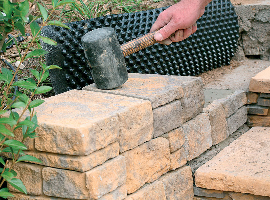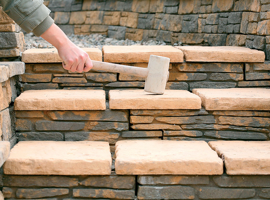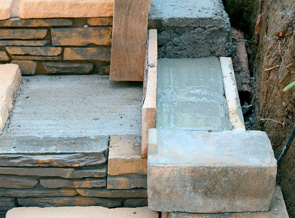 Na nástupnú plochu sa potom nasucho poukladajú betónové platne. Ak výška bočných dielcov nezodpovedá výške schodu, musia sa bočné steny oporného múra schodov dobetónovať na úroveň nasledujúceho radu oporného múru. Rozmery sa musia presne vypočítať na mieru daným podmienkam. Nasleduje nalepenie bočných dielcov na seba lepiacou maltou. Suchá zmes malty sa zmieša s vodou nízkootáčkovým miešadlom (max. 500 ot./min.) na homogénnu kašu bez hrudiek. Zmes sa nechá 5 minút odležať a opätovne sa premieša. Svah sa oddelí od schodov tzv. nopovou (kupolkovou) fóliou s výstupkami smerom k betónovým tvarovkám.