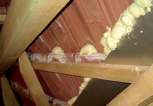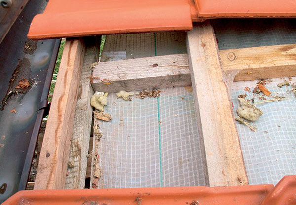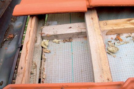 | Chýbajúce kontralaty, vynechané vetranie – nedodržanie základnej požiadavky na konštrukciu strešného plášťa. Nefunkčná strecha, všetky časti krovu a celej strechy sú namáhané vlhkosťou | Nesprávne zhotovenie detailu pri odkvape, kde došlo k upchaniu vetracieho prierezu. Nefunkčná strecha, všetky časti krovu a celej strechy sú namáhané vlhkosťou |