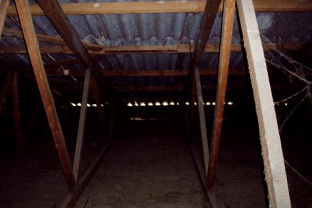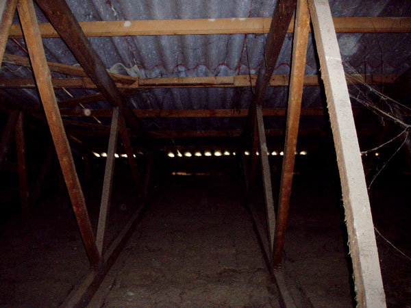 Pohľad do medzistrešného priestoru. Vetracie otvory sú len na výšku vlny strešnej krytiny a podhľadová konštrukcia je netesná. |