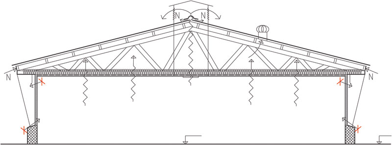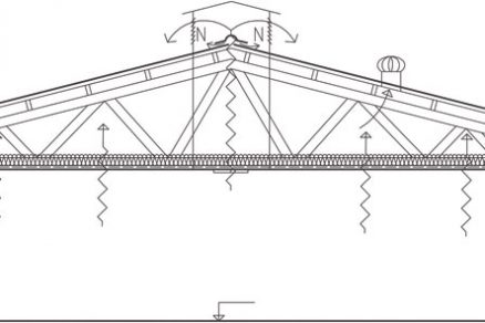 Na základe týchto okrajových podmienok treba realizovať nad vnútorným priestorom hál dvojplášťovú strechu so sklonom 14°, čo je tesne pod hranicou bezpečného sklonu. Ide o strešnú skladbu s jednou vetranou vzduchovou medzerou, pre ktorú je charakteristické umiestnenie tepelnoizolačnej vrstvy v priestore podhľadu medzi drevenými väzníkmi (v úrovni nosnej konštrukcie).