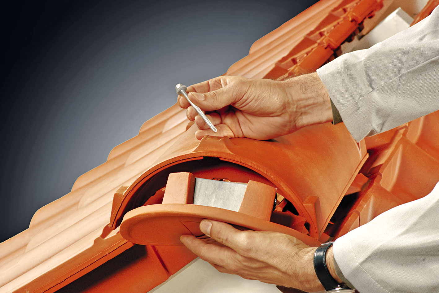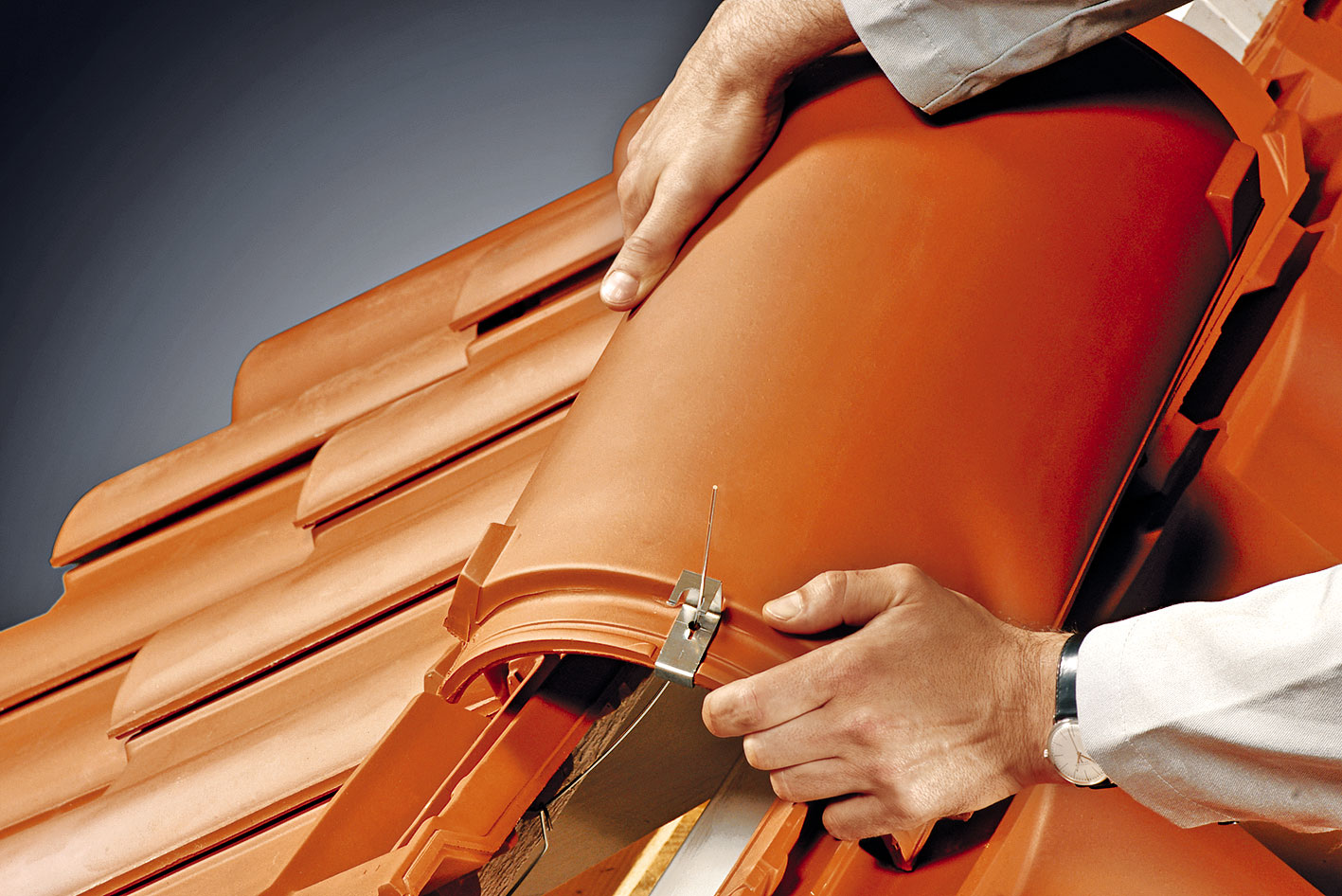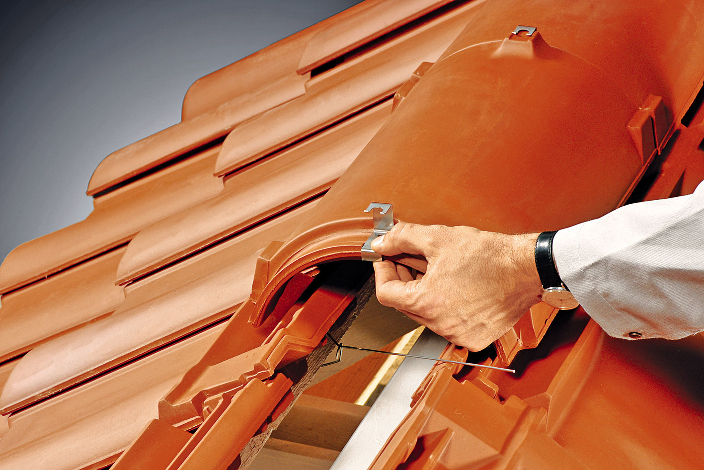 Pred ukladaním hrebenáčov sa na poslednú latu pri hrebeni prichytí drôt vo vzájomných rozstupoch približne 42 cm. Na zjednodušenie prevlečenia drôtu je potrebné nadvihnúť podhrebeňovú škridlu, prípadne sa ukladá až po prevlečení drôtov. Po prichytení o poslednú latu treba drôt zaistiť na konci háčikom. Následne sa na hrebenáč upevní príchytka hrebenáča. Príchytku treba upevniť tak, aby pri manipulácii nemohla vypadnúť. Hrebenáč sa uloží na podhrebeňové vetracie škridly. Následne sa drôt pretiahne cez príchytku a cez pripravený otvor v hrebenáči. Drôt sa ohne tak, aby zapadol do drážky v príchytke hrebenáča. Na prvom hrebenáči je potrebné vo zvýšenej časti určenej pre príchytku vyvŕtať otvor s priemerom 6 mm na zachytenie funkčného uzáveru hrebeňa.