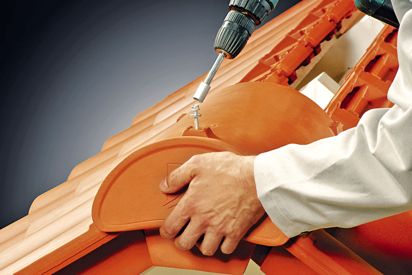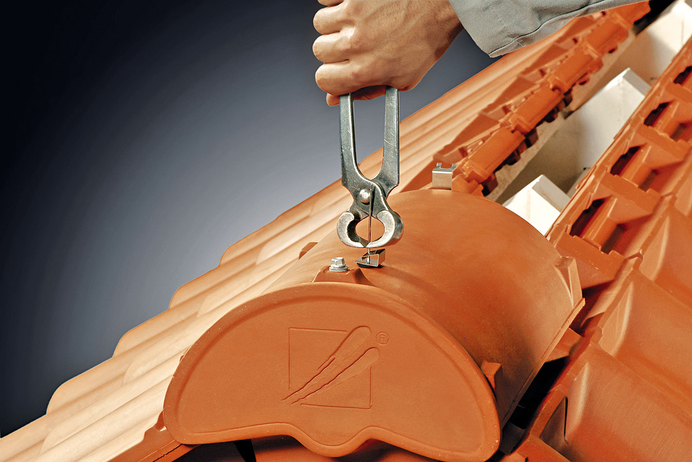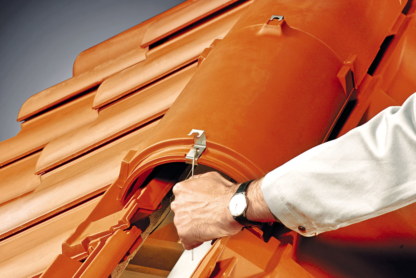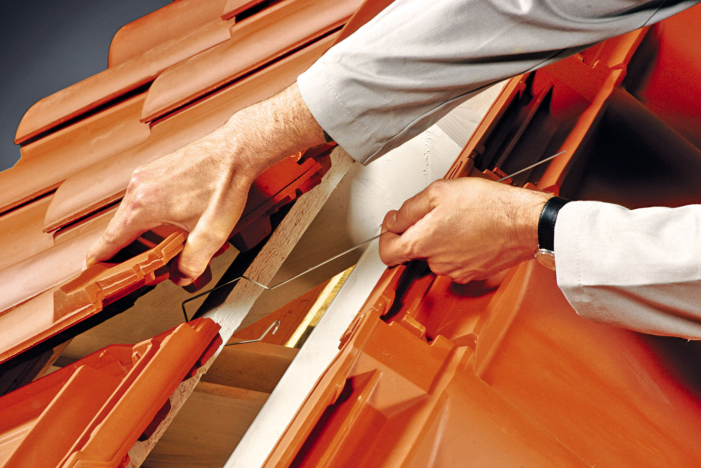 Pred ukladaním hrebenáčov sa na poslednú latu pri hrebeni prichytí drôt vo vzájomných rozstupoch približne 42 cm. Na zjednodušenie prevlečenia drôtu je potrebné nadvihnúť podhrebeňovú škridlu, prípadne sa ukladá až po prevlečení drôtov. Po prichytení o poslednú latu treba drôt zaistiť na konci háčikom. Následne sa na hrebenáč upevní príchytka hrebenáča. Príchytku treba upevniť tak, aby pri manipulácii nemohla vypadnúť. Hrebenáč sa uloží na podhrebeňové vetracie škridly. Následne sa drôt pretiahne cez príchytku a cez pripravený otvor v hrebenáči. Drôt sa ohne tak, aby zapadol do drážky v príchytke hrebenáča. Na prvom hrebenáči je potrebné vo zvýšenej časti určenej pre príchytku vyvŕtať otvor s priemerom 6 mm na zachytenie funkčného uzáveru hrebeňa.