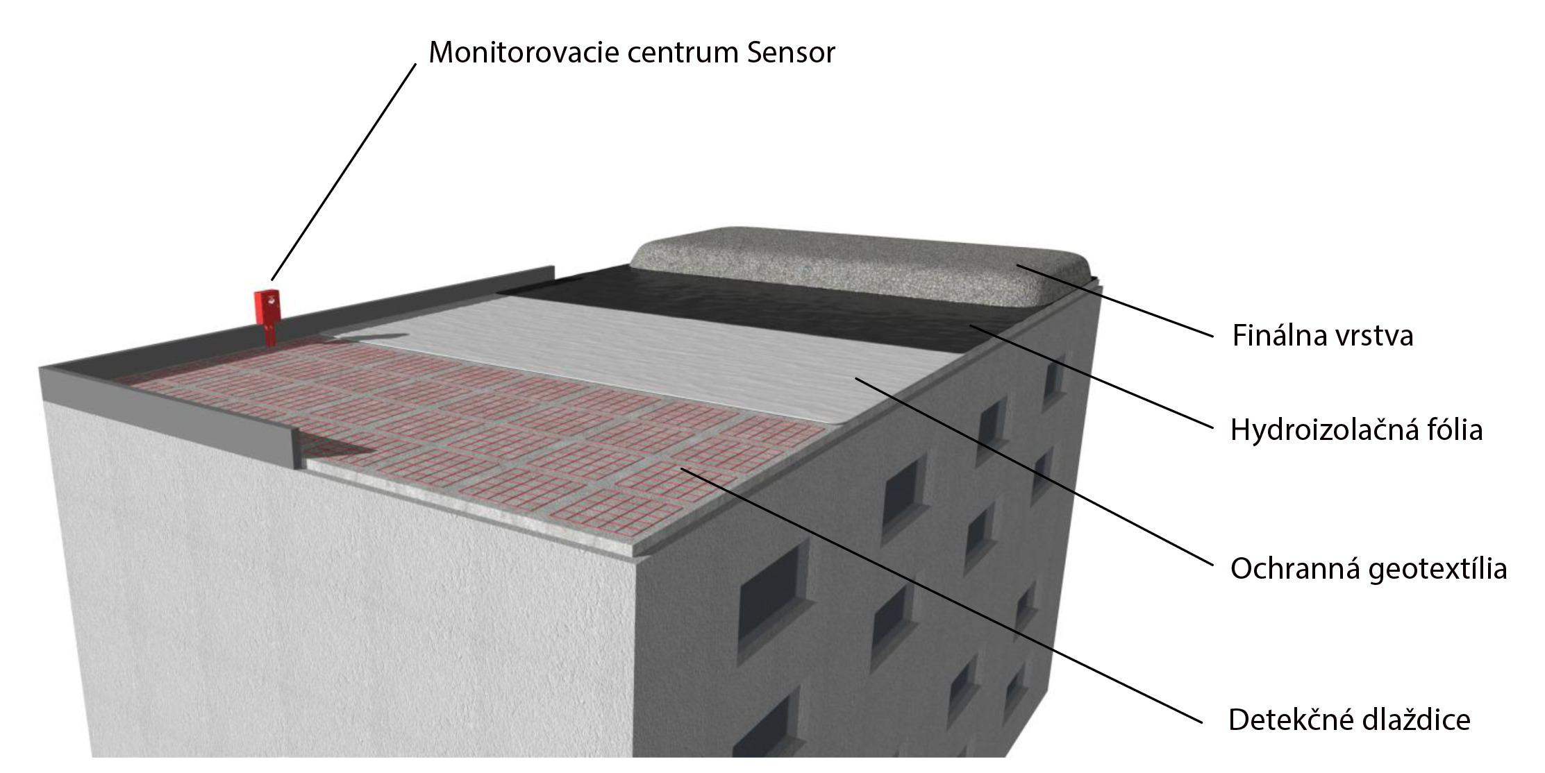 Koncept inteligentnej strechy spočíva v nepretržitej kontrole celistvosti hydroizolačnej vrstvy pomocou tzv. “detekčných dlaždíc” zabudovaných v profile strechy. V prípade poškodenia systém okamžite a automaticky vyhlási alarm. Ak sa teda porušenie izolácie opraví na lokalizovanom mieste okamžite, predíde sa takto ďalším priamym škodám a komplikáciám, ktoré by zatekanie spôsobilo. Súčasťou systému je dotykový displej umiestnený v interiéri, ktorý graficky znázorní plochu lokalizovaného poškodenia. Systém taktiež informuje majiteľa o poškodení izolácie zaslaním SMS správy a emailu vopred preddefinovaným osobám.