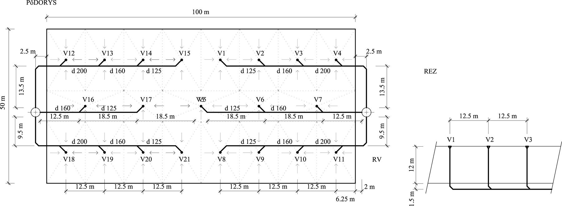 Na obr. 1 je pôdorys a rez halou so strechou s plochou 500 m2, ktorá je odvodnená gravitačným systémom. Hala má rozmery 25 × 20 m a je odvodnená tromi strešnými vtokmi a odpadovým potrubím DN 100, zvodové potrubie je DN 125. Výška haly je 12 m.