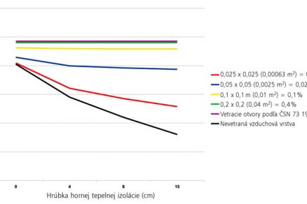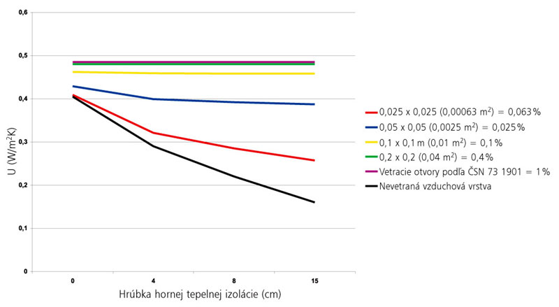 Pre overenie vplyvu vetrania na vplyv tepelnej izolácie sme použili výpočet priemerného súčiniteľa prestupu tepla vetranej dvojplášťovej strechy v závislosti od veľkosti vetracích otvorov a dimenzie dodatočnej tepelnej izolácie na vrchnom plášti. Počítali sme s priemernou rýchlosťou vetra 3 m/s. Ako modelová je zvolená strecha s nasledujúcou skladbou: