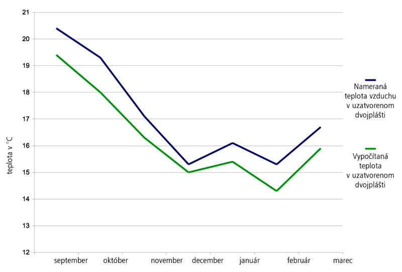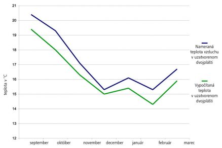 Z grafu 3 vyplýva, že výpočet priemernej teploty vzduchu vo vzduchovej vrstve za jednotlivé mesiace takmer zodpovedá praktickému meraniu. Rozdiel medzi zmeranými a vypočítanými hodnotami je minimálny. Tepelno-technický výpočet teda zodpovedá reálnemu stavu.