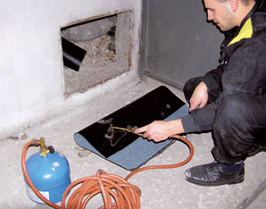 Prístup do vzduchovej vrstvy umožňujú revízne otvory. Jeden otvor sa vždy nachádza v každej vchodovej sekcii. Aby boli merania čo najpresnejšie a vytvorila sa nevetraná vzduchová vrstva, všetky tieto otvory sme uzatvorili asfaltovým pásom (obr. 3). Merania prebiehali v období od septembra do marca.