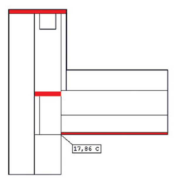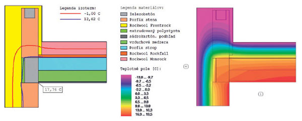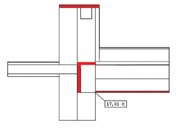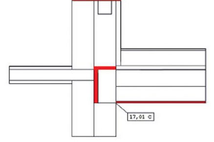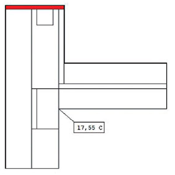 Najnepriaznivejší stav detailu D22 sa dosiahol bez použitia sadrokartónového podhľadu a penového skla vloženého pod atiku. Teplota v styku stropu a steny je o 0,2 K nižšia ako pri realizovanom variante (D221), a to θsi = 17,55 °C (obr. 8). Ukončenie atiky tepelným izolantom v horizontálnom smere nemá pri tomto riešení a výške atiky asi 1 000 mm žiaden vplyv na teplotu v rohu miestnosti.
