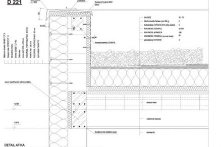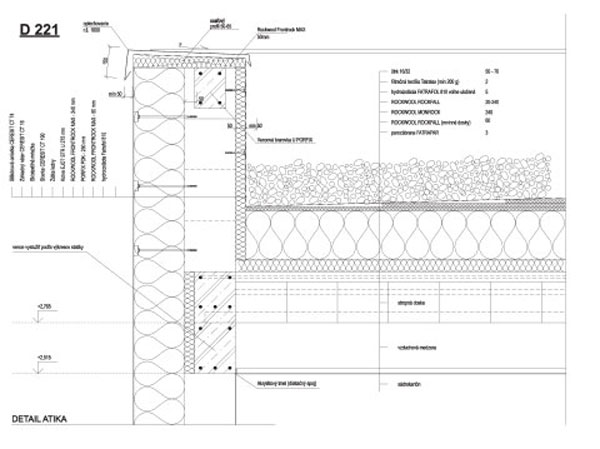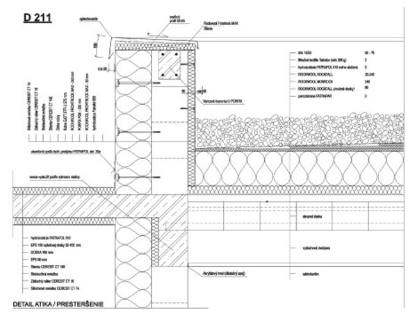 Detail 21 (obr. 2) je existujúce riešenie detailu atiky a prestrešenia medzi domom a garážou a je v systéme kódovania označený ako D211 (tab. 1). Stropná doska je zo sivého pórobetónu, tepelná izolácia strechy je zabezpečená ťažkou dvojvrstvovou izolačnou doskou a systémom spádových tepelnoizolačných dosiek z minerálnej vlny. Z interiérovej strany zakrýva vzduchotechnickú inštaláciu sadrokartónový podhľad. Na horizontálne ukončenie atiky sa použili tuhé dvojvrstvové tepelnoizolačné dosky z minerálnej plste.