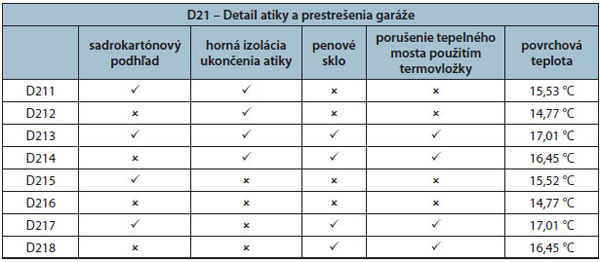 | Tab. 1 Označenie alternatívnych riešení D21 a výsledná teplota vnútorného povrchu pri rôznych alternatívach vyhotovenia detailu |