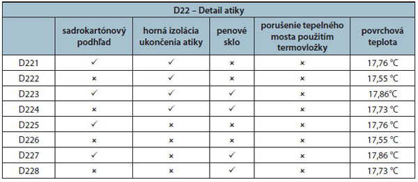Tab. 2 Označenie alternatívnych riešení D22 a výsledná teplota vnútorného povrchu pri rôznych alternatívach vyhotovenia detailu |