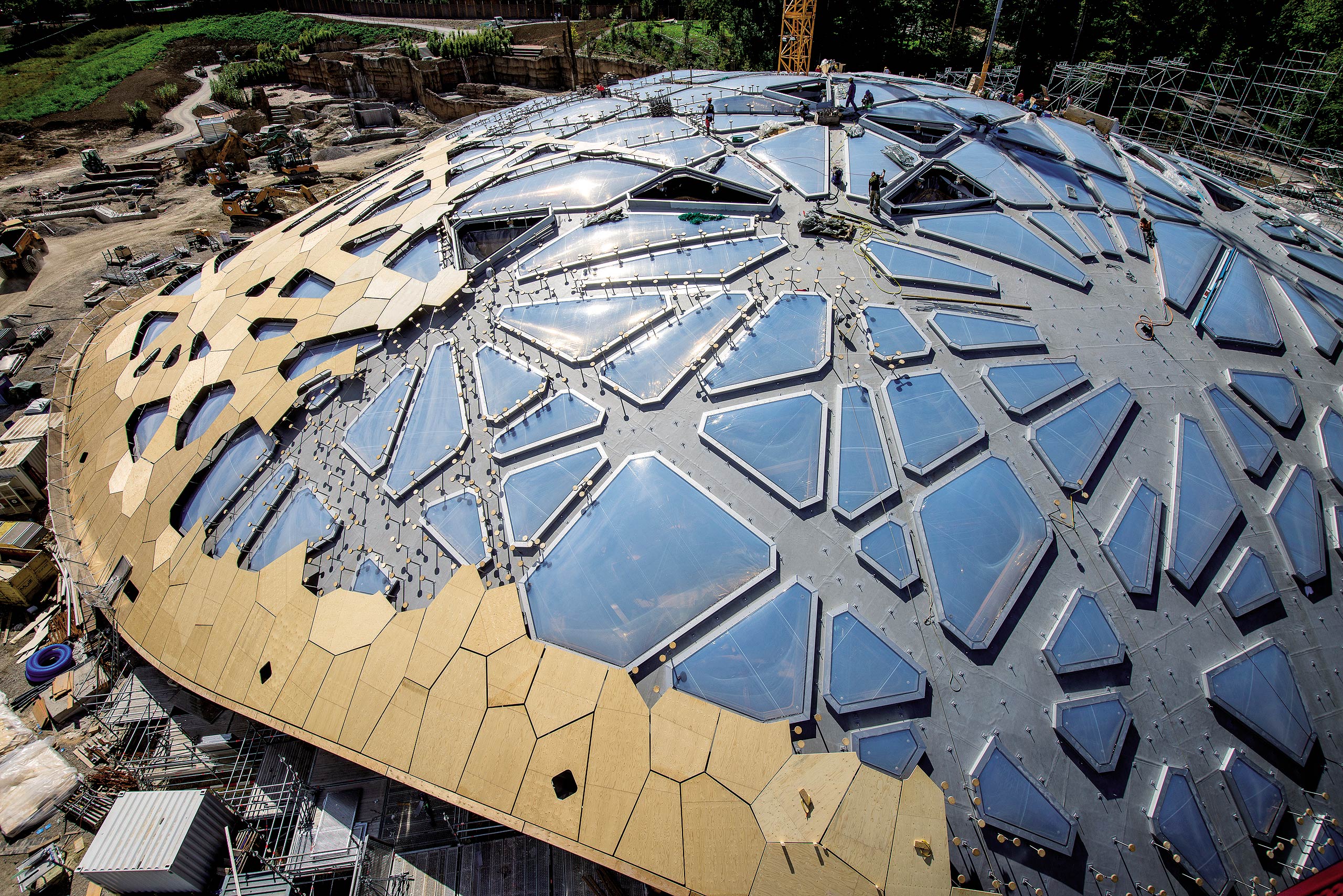 Strecha je podopretá nosnou konštrukciou z pohľadového betónu umiestnenou po obvode, ale hlavné zaťaženie z obrovskej drevenej konštrukcie strechy je absorbované obvodovými základmi. Tie sa skladajú z predpätých betónových pilót, ktoré prenášajú záťaž do zeme. Pri streche bol kľúčový výber osvedčeného a spoľahlivého systému hydroizolácie. Všetky potrebné prestupy, detaily a približne 1 500 rohov muselo byť vyrobených ručne, vzhľadom na rôzne uhly, pre ktoré štandardné profily neboli k dispozícii. Aby boli splnené estetické požiadavky architekta a tiež sa vytvoril priestor na čistenie a údržbu, tak 50 cm nad izolačnou fóliou bola na 5 615 terčíkoch upevnená drevená plošina, ktorú bolo potrebné utesniť membránou. Prístup udržateľnej výstavby pri tomto projekte vyžadoval, aby sa dažďová voda zo strechy zhromažďovala a ďalej využívala pri starostlivosti o slony.