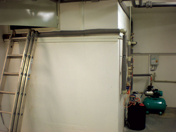 Umiestnenie akumulačnej nádrže zrážkovej vody v rámci dispozície podzemného podlažia – či už v pivnici, alebo strojovni (obr. 3) – je oproti stavbe podzemnej nádrže jednoduchšie. V porovnaní s podzemnou nádržou sa v tomto prípade nevyžadujú výkopové práce pre nádrže a vedenia potrubí. Aj obsluha tejto nádrže je jednoduchšia vzhľadom na jednoduchý a ľahký prístup. K nevýhodám patria priestorové nároky v rámci dispozície podlažia či reálna možnosť zaplavenia podzemného podlažia. Nádrž sa môže umiestniť priamo v rámci dispozície suterénu alebo sa môže vybudovať ako samostatná menšia miestnosť po stavebných úpravách. Samozrejme, veľkosť nádrže limitujú priestorové možnosti danej dispozície.