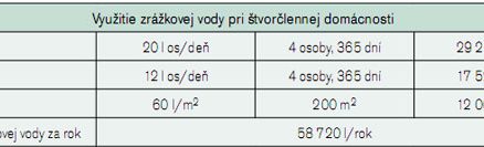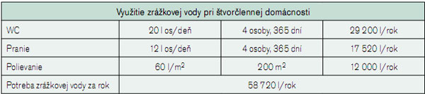 Príklad výpočtu objemu nádrže pre štvorčlennú domácnosť, kde sa zrážková voda bude využívať na splachovanie toaliet, pranie a polievanie záhrady, je uvedený v tab. 4 [1].