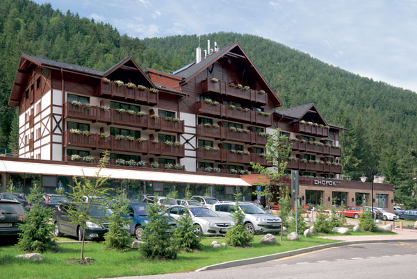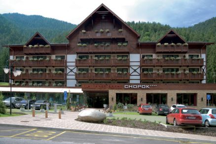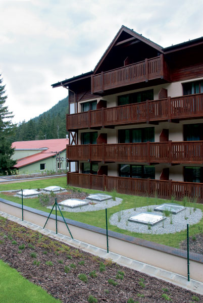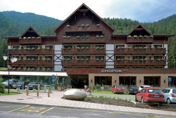 Na úpätí najväčšieho turistického a lyžiarskeho strediska na Slovensku, v Jasnej, v srdci horskej prírody Nízkych Tatier sa nachádza moderný hotelový komplex Wellness hotel Chopok (obr. 1). Harmonické spojenie s krajinou sa dosiahlo nielen vďaka tvarom a umiestnením objektu, ale aj vďaka celkovému vzhľadu, výberu materiálov s ohľadom na okolité prostredie. Päťpodlažná budova, ktorá svojou architektúrou pripomína horský objekt, disponuje predsunutým prízemím s celozasklenenými stenami, ktoré rytmicky oddeľuje kamenné obloženie (obr. 2).