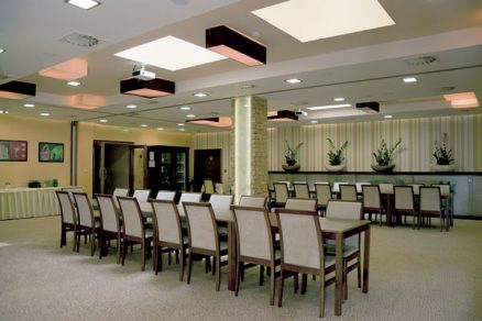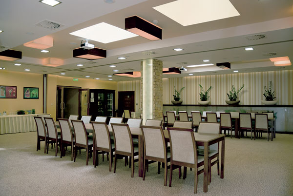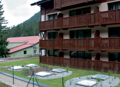 Nad vstupnou časťou s reštauráciami, konferenčnými miestnosťami a službami hotela sa nachádzajú drevené balkóny izieb, ktoré prispievajú k zvýrazneniu hlavnej hmoty a k efektnému členeniu celej fasády. Zadná časť budovy je zapustená do svahu a je orientovaná na južnú stranu smerom k lesu. Vzhľadom na okolité podmienky a charakter pozemku sa presvetlenie interiéru neriešilo cez fasádu, ale pomocou strešných okien umiestnených do plochej strechy (obr. 3 až 5). So štýlovo vybaveným interiérom s moderným dizajnom (obr. 6) ladí i výhľad na plochu strechy s vysadenou zeleňou (obr. 7). Najlepší výhľad poskytuje kongresová sála.
