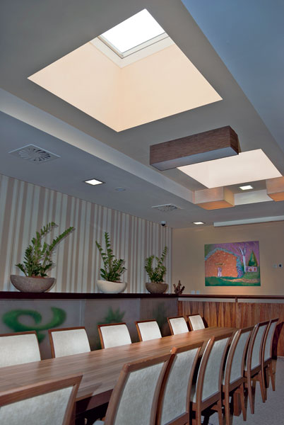 Presvetlenie oknami vhodnými do plochej strechy prináša niekoľko výhod. Použitím okien do plochej strechy sa vďaka vysokému prieniku svetla šetrí elektrická energia, ktorá by bola inak potrebná pri použití umelého osvetlenia, a zároveň sa vytvára zaujímavý svetelný efekt (obr. 9).