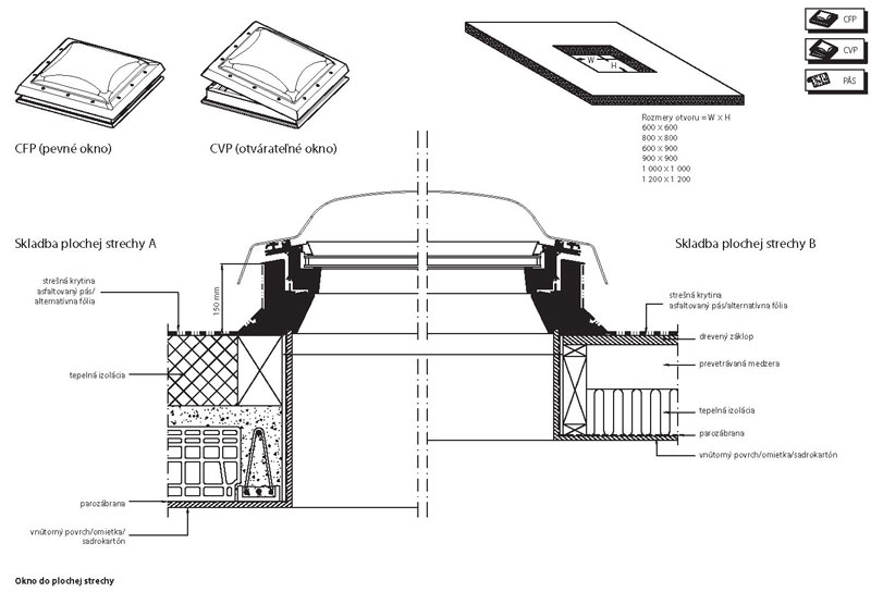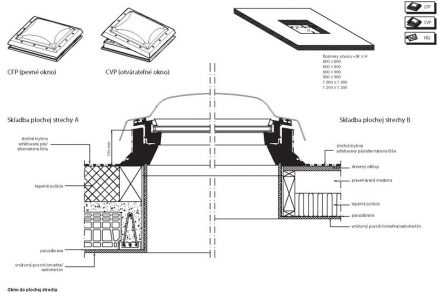 • pevné neotváravé okno do plochej strechy, vhodné do priestorov s požiadavkou na presvetlenie. Na zasklenie sa používa izolačné dvojsklo spĺňajúce tepelnoizolačné požiadavky normatívnych predpisov a polykarbonátová kopula;