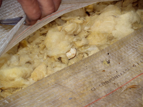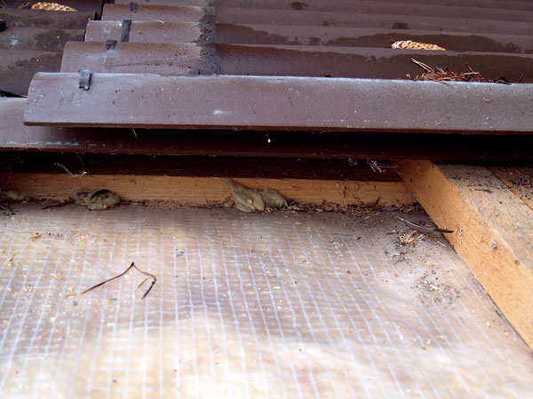 Príčinou zvýšenia objemu býva práve nízka objemová hmotnosť izolácie. Dôvodom deštrukcie odvetranej vzduchovej vrstvy (obr. 2) však v tomto prípade bola aj zvieracia rodinka kuny lesnej, ktorá sa nasťahovala do priestoru pod krytinou, vytvorila si v ňom prístupové chodbičky a vykonávala v ňom svoje základné potreby. Na obrázku vidieť zvyšky potravy – vajíčka a perie zo sliepok (obr. 3).