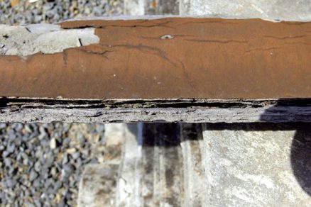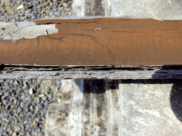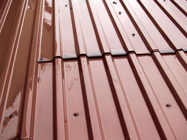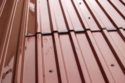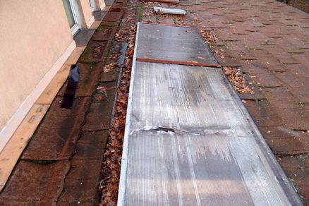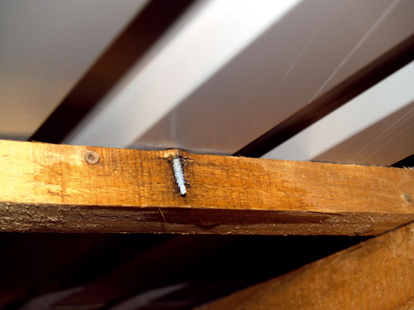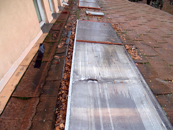 Štvrtý typ poruchy sa prejavil na streche nad prístavbou školského pavilónu s pomerne nízkym skonom, kde strešnú krytinu vytváral trapézový plech na latách. O nesprávnom spôsobe montáže svedčil pohľad z vonkajšej strany (obr. 8) – veľká medzera medzi priečnym spojom dvoch trapézových plechov, chýbajúce uchytenie v spoji, viditeľné skrutky mimo spoja a pod.