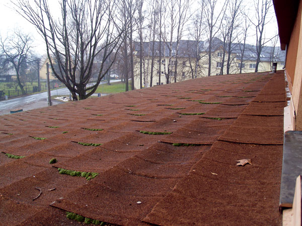V tomto prípade nebolo dôležité posudzovať strešnú skladbu, aj keď ani tá nepredstavovala ideálne riešenie. Použitú krytinu tvorila plechová škridla, ktorá sa namontovala na strechu so sklonom 9,5° (obr. 6). Došlo však k zjavnej deformácii vlastných šablón krytiny, a to napriek tomu, že strecha sa realizovala v roku 2001, teda pomerne nedávno. Krytinu navyše výrobca dodal na stavebný trh so slovným sprievodom, že vydrží neobmedzený čas a môže sa montovať už od sklonu 10 až 15°. No stav strechy sa dal označiť za havarijný (obr. 7). Prejavovalo sa to viditeľným rastom machov a prenosom vlhkosti do strešnej krytiny.
