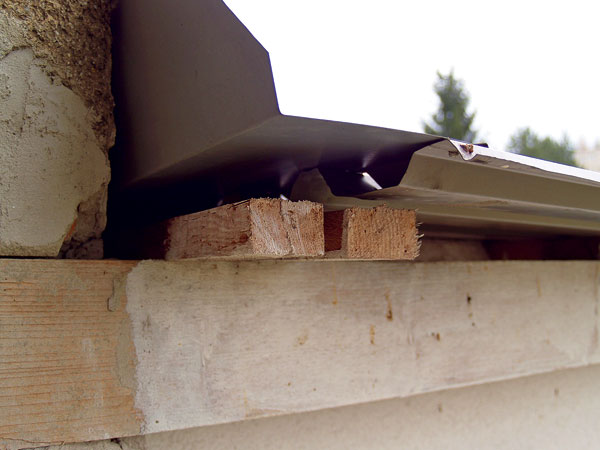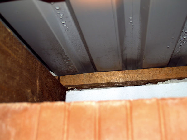 Ďalším nedostatkom montáže bolo riešenie na okrajoch strechy. V tejto časti došlo k porušeniu základných princípov oplechovania, v dôsledku čoho vznikol viditeľný priechod pre atmosferické zrážky (obr. 9). Chybu dokazujú aj prieniky samorezných skrutiek mimo strešnej laty a pretekajúca voda (obr. 10). Aj napriek tomu, že strecha bola v projektovom riešení odvetraná, zhotoviteľ odvetranie odmietol so slovami, že do podstrešia bude prenikať prach a sneh (dôsledok vidno na obr. 11).