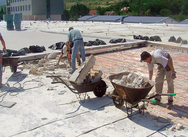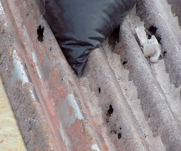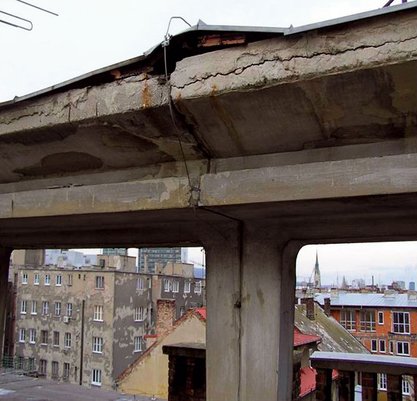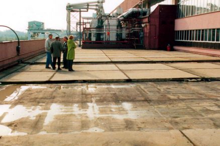 | Nasiakavé tepelnoizolačné vrstvy dlhodobo akumulovali vlhkosť a spôsobovali koróziu nosných plechov až po úplnú deštrukciu stropu. Vlhkosť bola uzavretá medzi plechovými doskami a fóliou EPDM. | ||