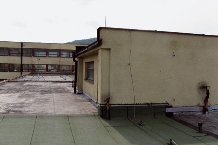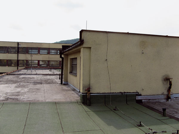 - aplikácia prídavnej tepelnoizolačnej vrstvy z dosiek extrudovaného polystyrénu na pôvodnú krytinu obnovenú modifikovaným asfaltovaným pásom a stabilizačnou vrstvou (betónové dlaždice kladené na terče),