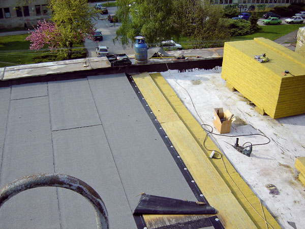 aplikácia prídavnej tepelnoizolačnej vrstvy z polystyrénových dosiek a novej krytiny z asfaltovaných pásov na betónovej mazanine (tento prípad nie je príliš vhodný, lebo ide o mokrý proces),