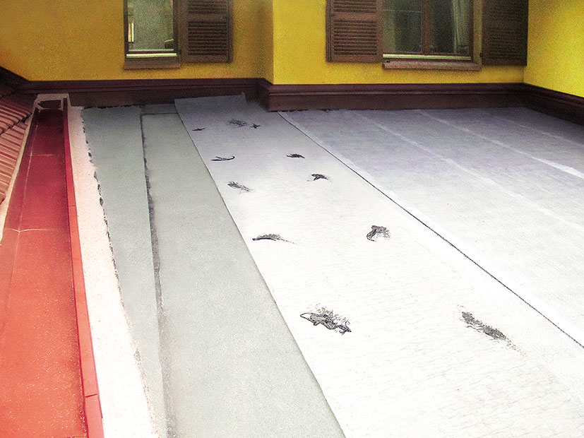 Na nosný betónový podklad strechy ošetrený penetráciou sa aplikuje asfaltová parozábrana, vrstva tepelnej izolácie a potom hlavná hydroizolačná vrstva z dvoch asfaltovaných pásov. Ako spodný pás možno použiť modifikované asfaltované pásy, na ktoré sa natavia pásy s funkciou ochrany proti prerastaniu koreňov rastlín.